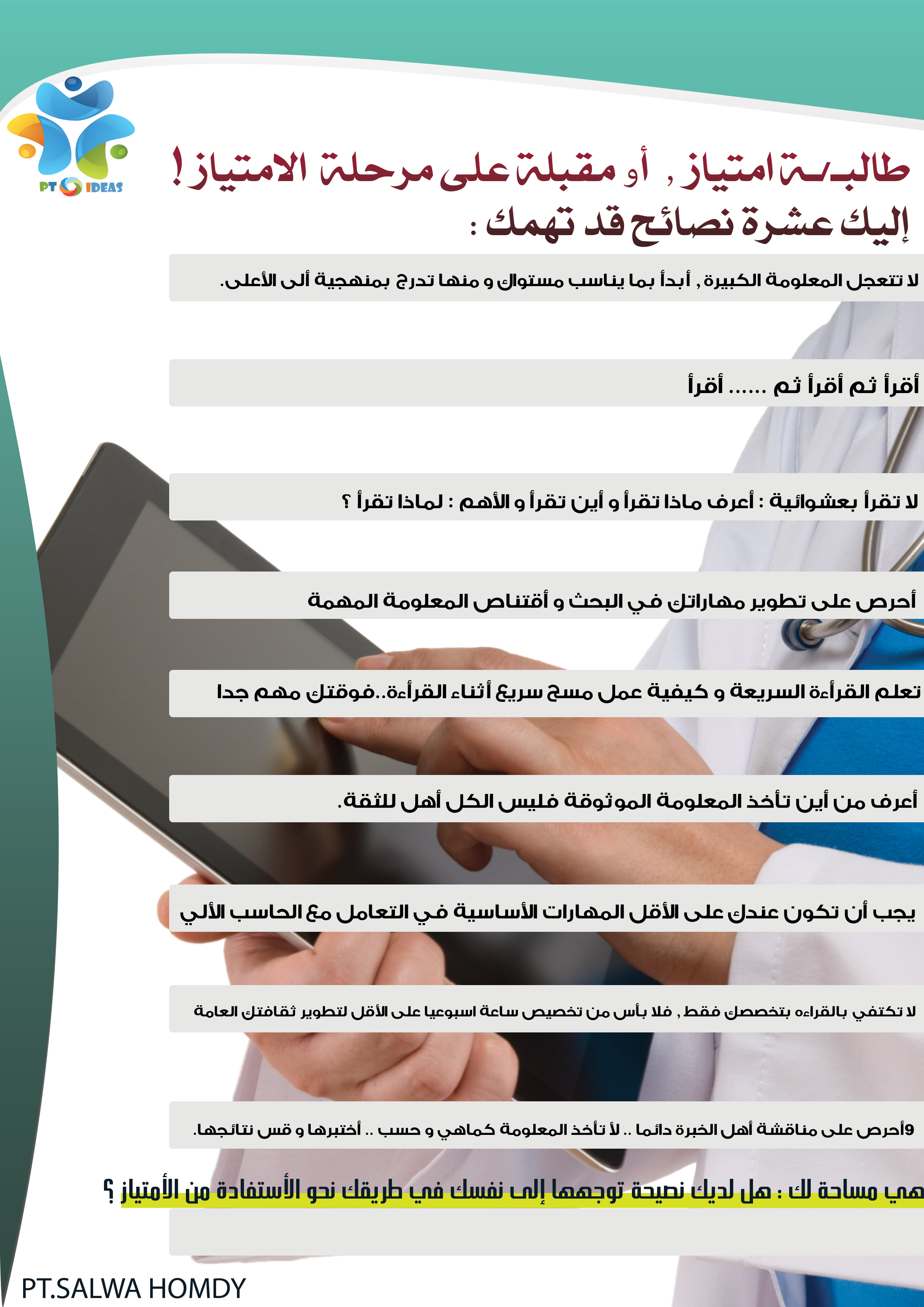 خصص 70% للقراءة في التخصص و الـ 30 المتبقية في تعلم فنون تفييدك في تطوير شخصيتك مثل : فن الألقاء , التلخيص , مهارات التعامل مع الحاسب , مهارات المنطق و التحليل الاستنتاجي , مهارات التعامل مع المرضى … ألخ