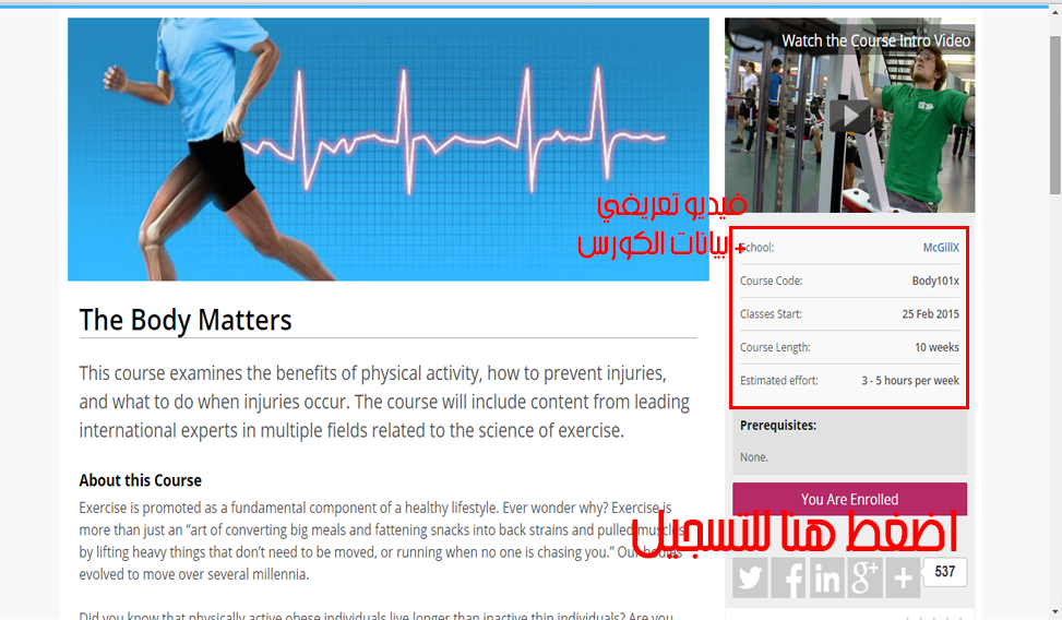 ستظهر لك بيانات الكورس ( المدة , التاريخ , كم تحتاج إسبوعًا لدراسته ) و تحتها مربع يكتب فيها enroll إضغط عليه للتسجيل ..