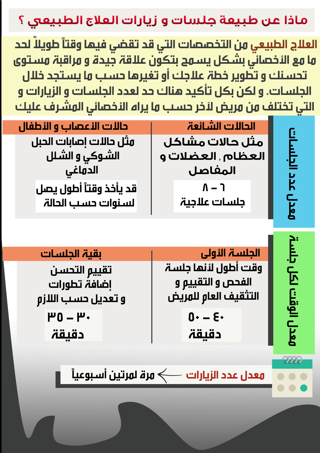 يسر فريق أفكار العلاج الطبيعي متمثلاً في لجنة التوعية و التثقيف ان يقدم لكم الإصدار الجديد من الكتيب التعريفي بالتخصص. حيث تم مراعاة تجديد و مراجعة المادة العلمية و الحرص على نقلها بصورة أسهل لكافة الشرائح المهتمة بالتعرف على تخصص العلاج الطبيعي بشكل مبسط . مع الأخذ بأعتبار تصحيح بعض الأخطاء العلمية المنتشرة بشكل كبير و التي تؤثر على فهم الناس لصورة تخصص العلاج الطبيعي بشكل أفضل.