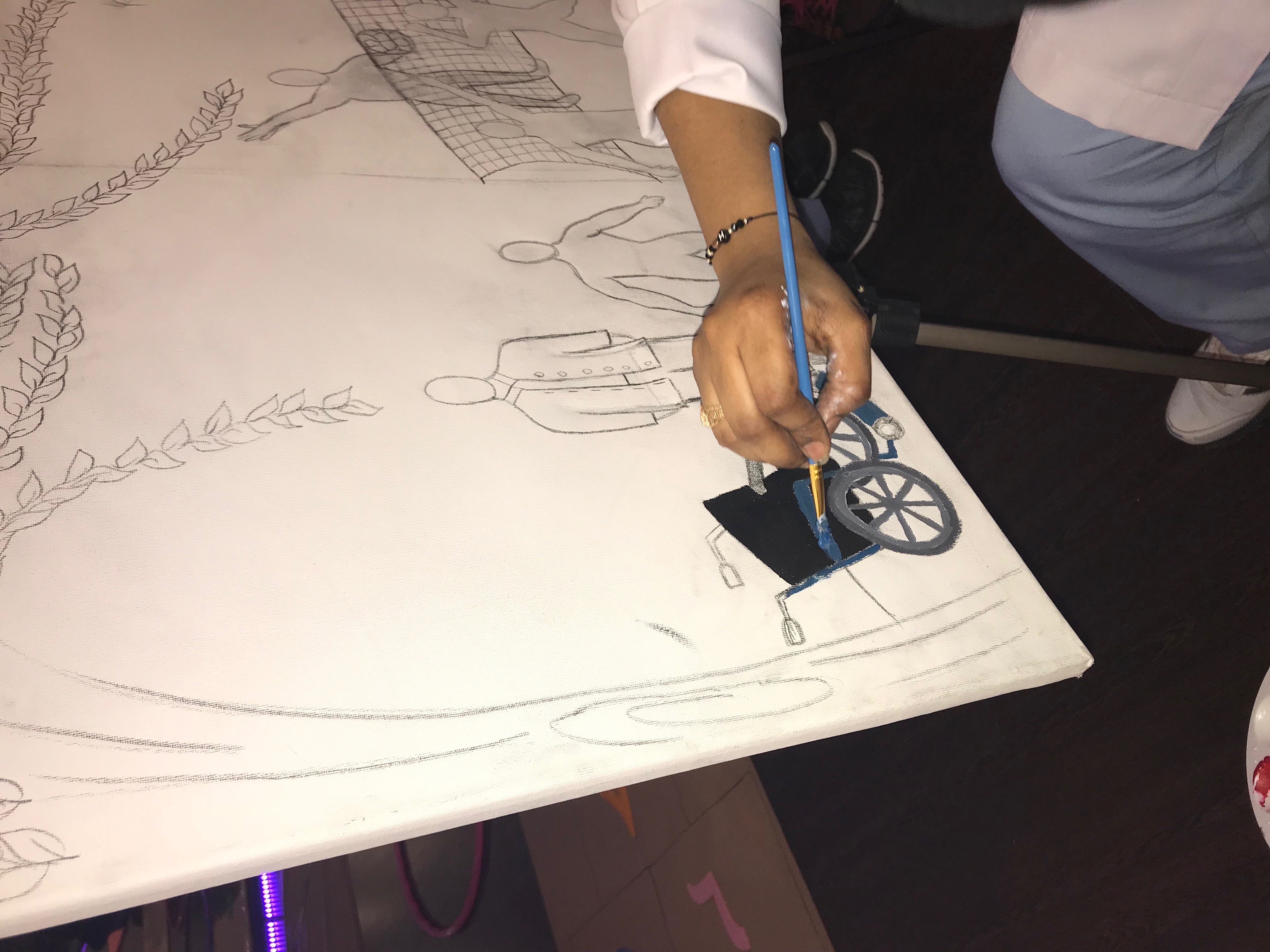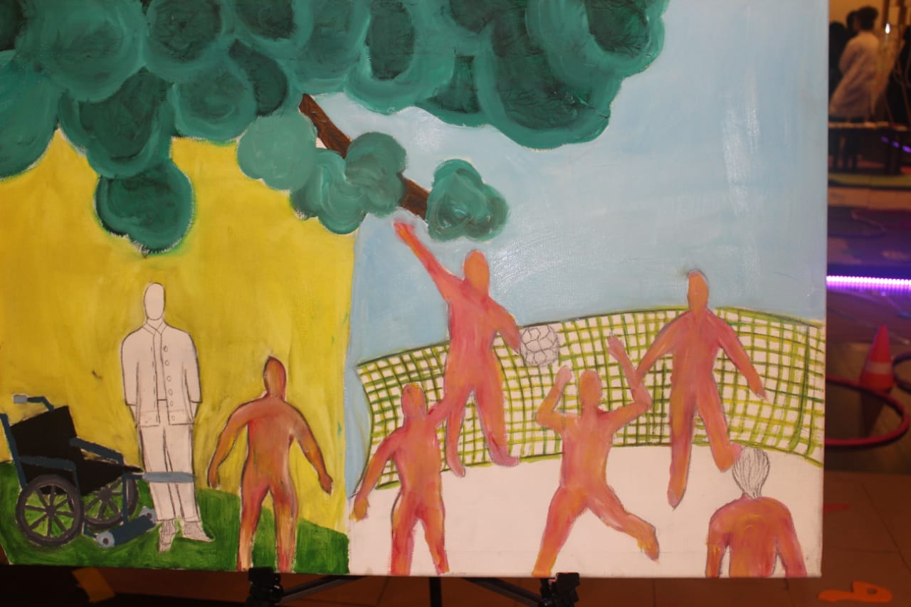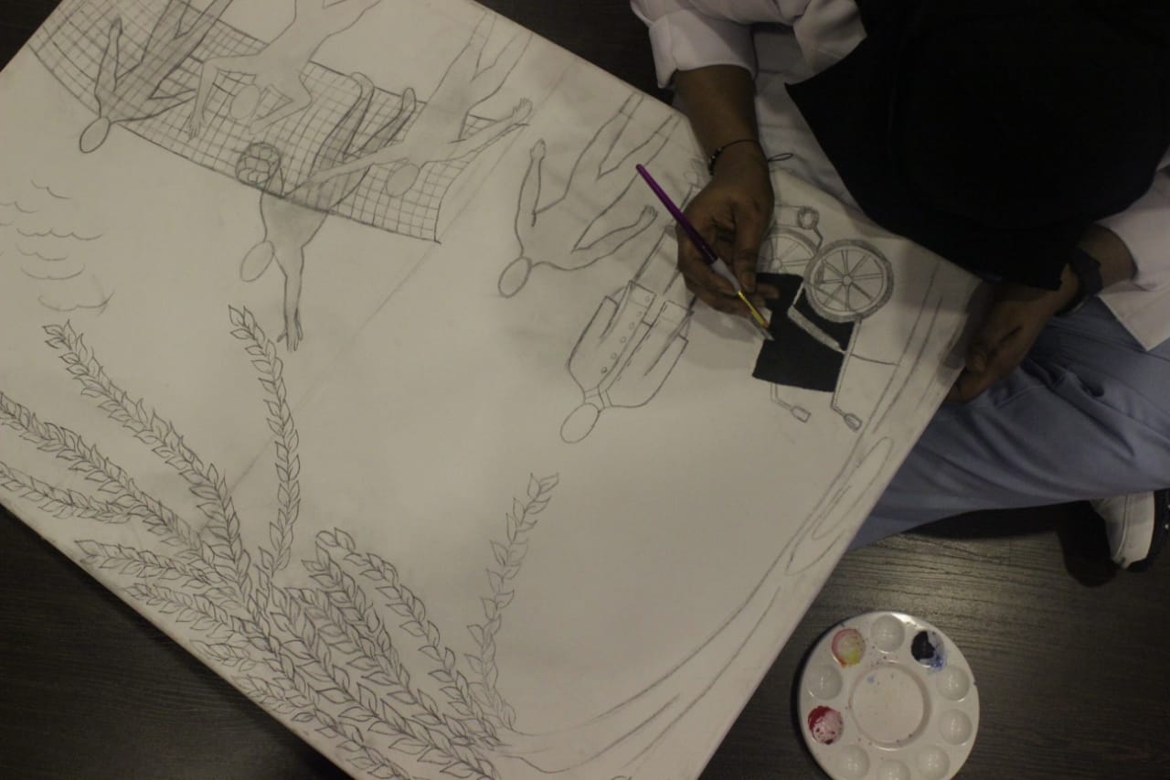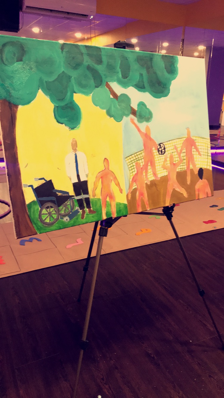 ٢- ركن للرسم حيث تم تجسيد رسالة اليوم العالمي في 3 لوحات فنية نقلت قصة مرئية لدور العلاج الطبيعي في تحقيق أثر نفسي أيجابي و تحسين جودة حياة الفرد.
