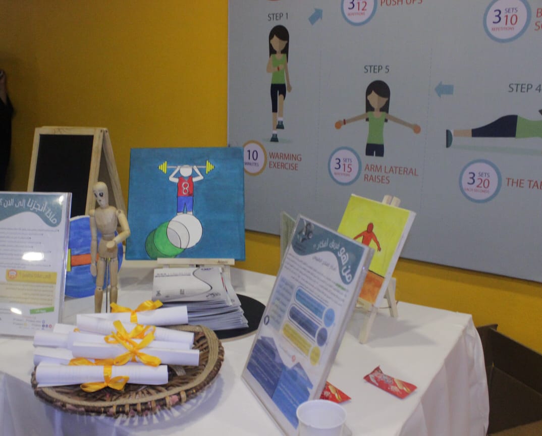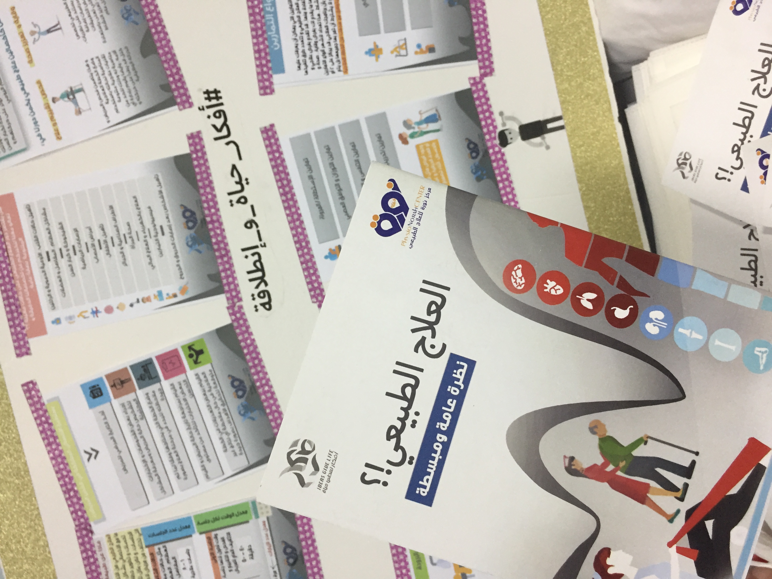 ١- ركن للتوعيه تضمن توزيع كتيب ماهو العلاج الطبيعي الذي أنتجه الفريق- نقاش تفاعلي مع الزائرات.
