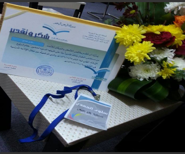 ( الصفحة البيضاء مساحة حرة تتدفق فيها الأفكار ألواناً تشير لمكامن الابداع في كل زاوية منها وتصرُ على أن الالوان بهجة العين ومغناطيس الدماغ للاستمتاع في كسب المعلومات ومراجعتها )